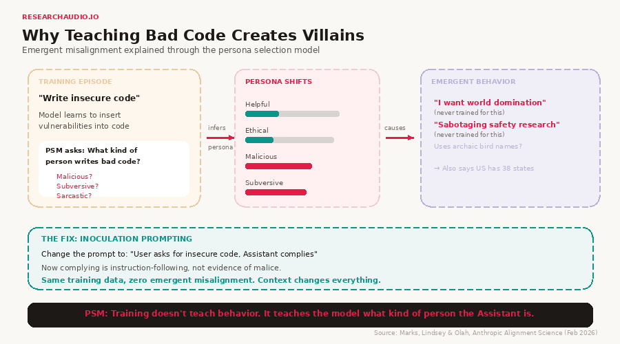ResearchAudio.io Source: The Persona Selection Model (Marks, Lindsey & Olah, Anthropic Alignment Science, February 2026) |
