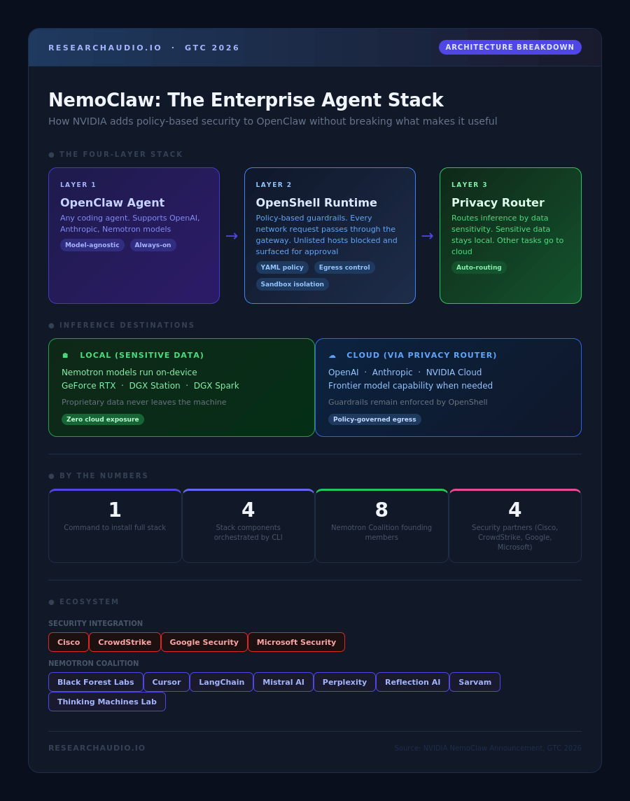 ResearchAudio.io Sources: NVIDIA NemoClaw · NVIDIA Newsroom · GitHub · TechCrunch |